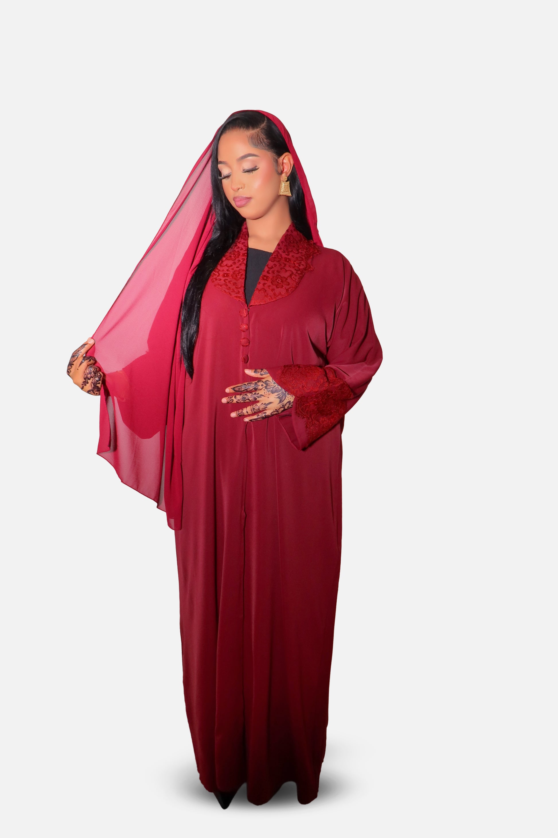 A timeless abaya crafted with a elegant lace-trimmed collar and matching cuffs. Made from soft, flowy fabric that drapes beautifully, offering luxury and modesty in every color, Sky Blue, Green, Brown, Burgundy, and Black. Perfect for any occasion.